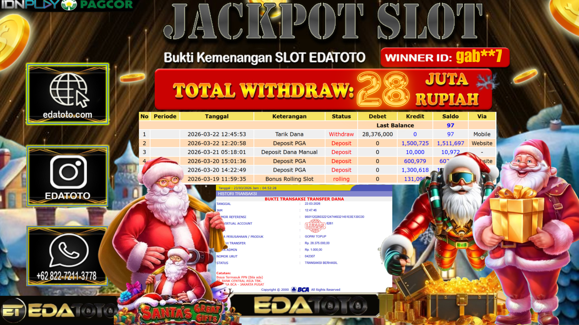 Selamat Kepada Pemilik user ID : gab**7 Hari/Tanggal : Minggu / 22 MARET 2026 Jackpot : Rp, 23,014,000 JT Withdraw . . .