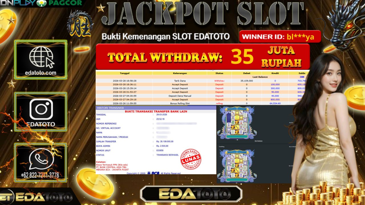 Selamat Kepada Pemilik user ID : bl***ya Hari/Tanggal : Sabtu / 28 MARET 2026 Jackpot : Rp, 28,254,810 JT Withdraw . . .