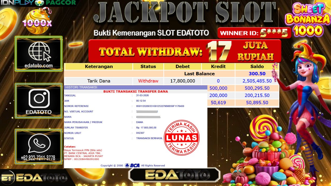Selamat Kepada Pemilik user ID : S***5 Hari/Tanggal : Senin / 30 MARET 2026 Jackpot : Rp, 15,254,281 JT Withdraw . . .