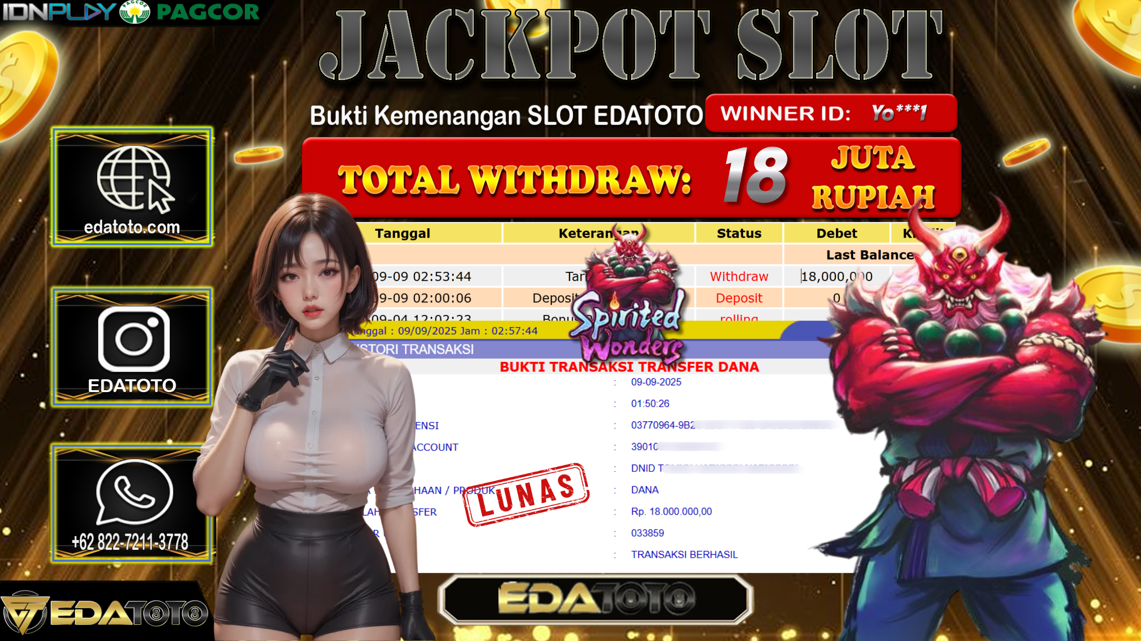 Selamat Kepada Pemilik user ID : Yo***1 Hari/Tanggal : Selasa/ 9, September 2025 Jackpot : Rp. 18.000.000 JT Permainan : . . .