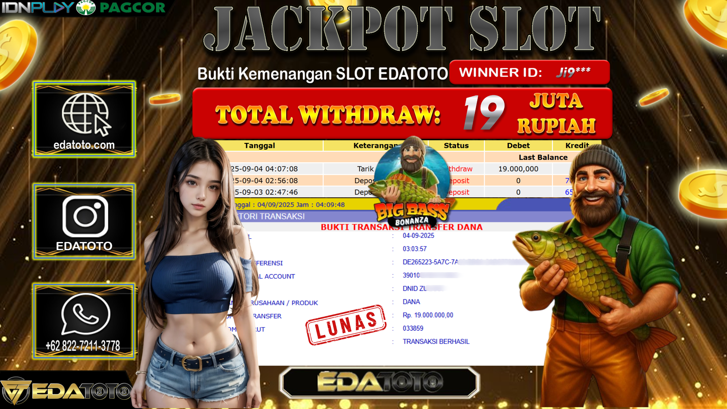 Selamat Kepada Pemilik user ID : Ji9*** Hari/Tanggal : Kamis/ 4, September 2025 Jackpot : Rp. 19.000.000 JT Permainan : . . .