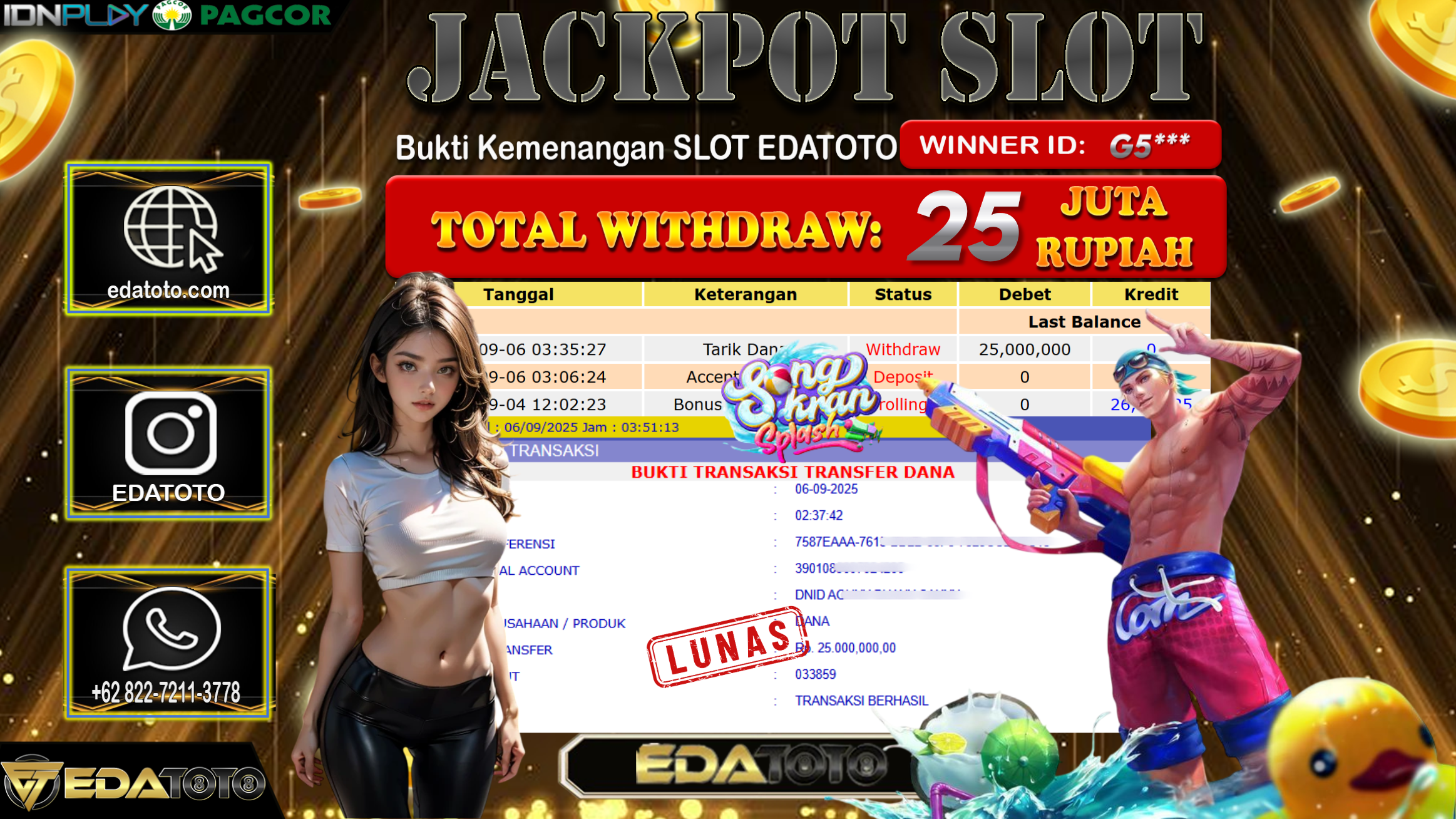 Selamat Kepada Pemilik user ID : G5*** Hari/Tanggal : Sabtu/ 6, September 2025 Jackpot : Rp. 25.000.000 JT Permainan : . . .