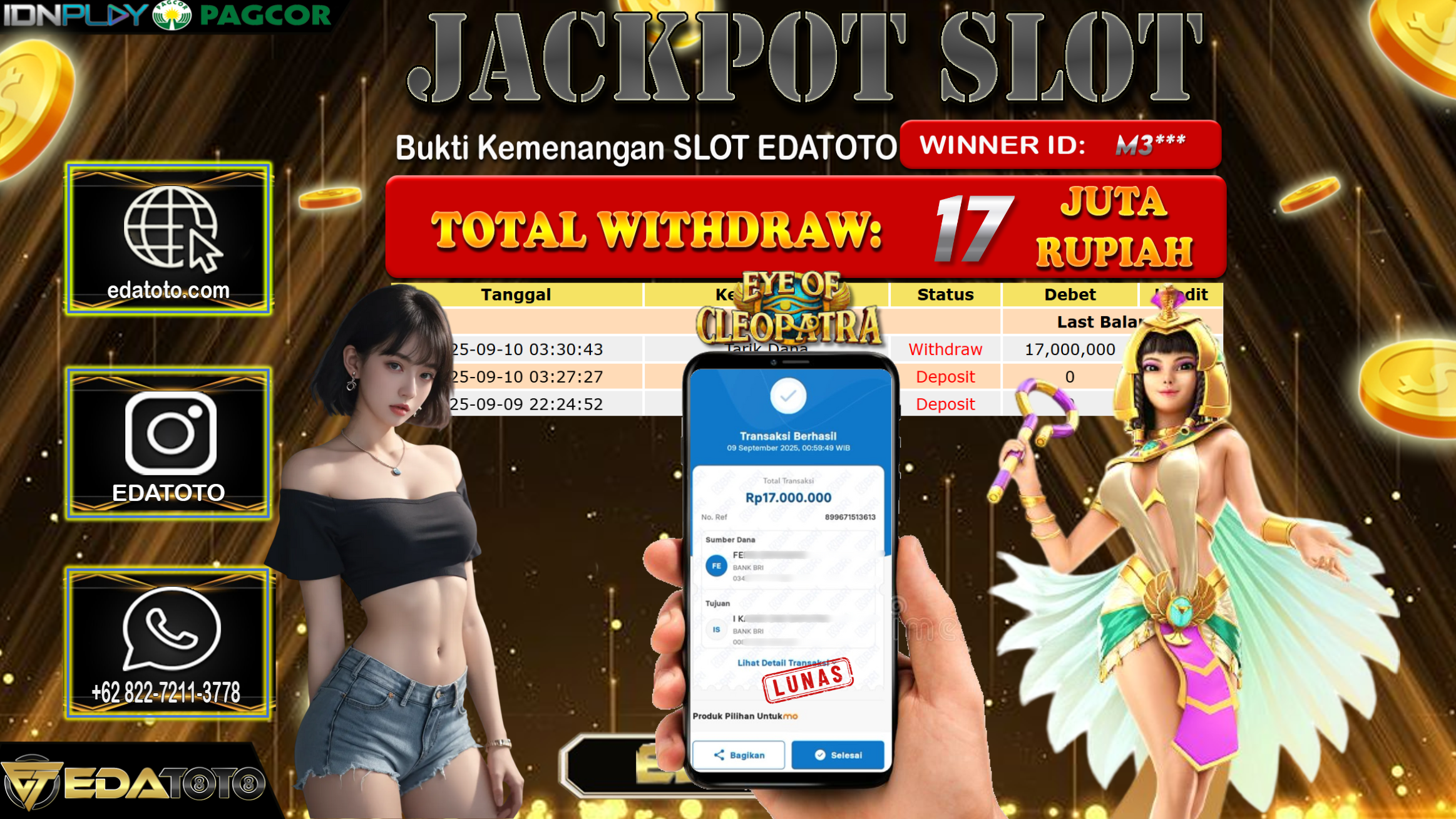 Selamat Kepada Pemilik user ID : Mo*** Hari/Tanggal : Rabu/ 3, September 2025 Jackpot : Rp. 17.000.000 JT Permainan : . . .
