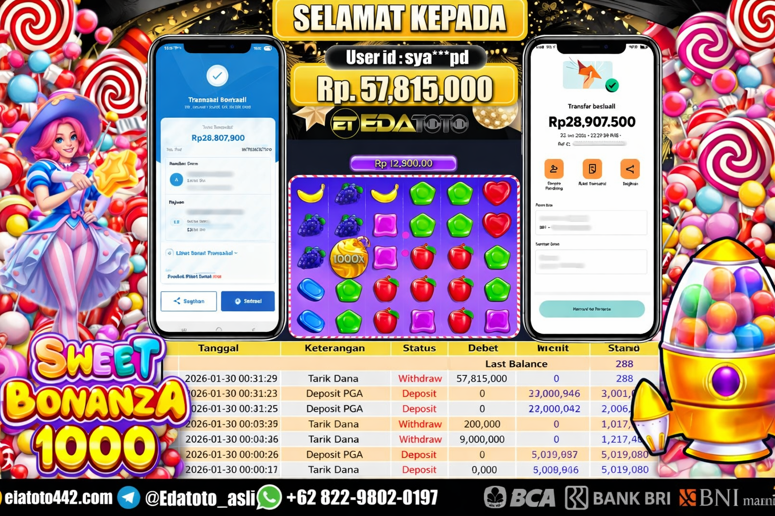 Selamat Kepada Pemilik user ID : sya***pd Hari/Tanggal :jumat/ 30 Januari 2026 Jackpot : Rp. 57,815,000 JT Withdraw : 57,815,000 . . .