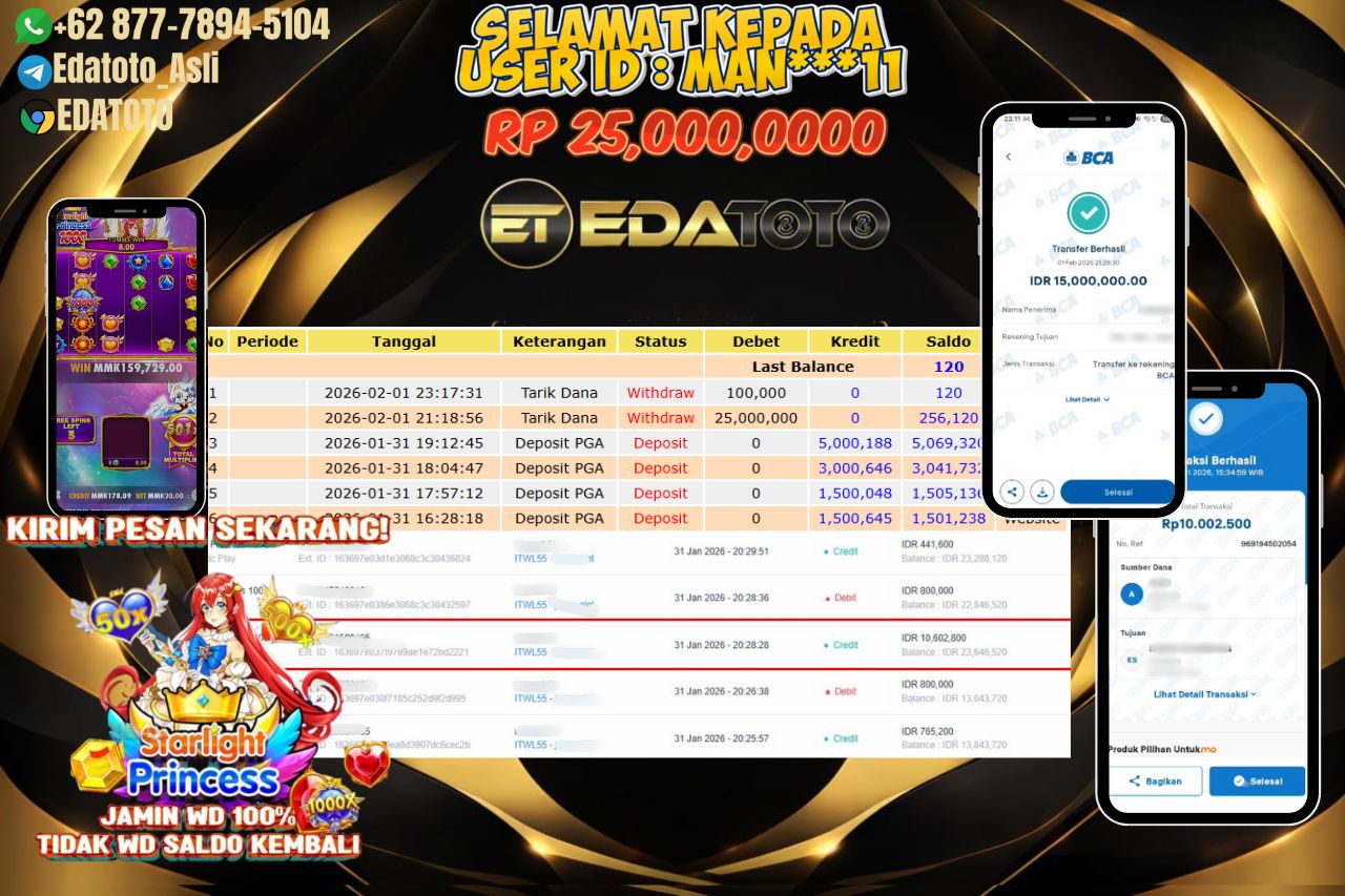 Selamat Kepada Pemilik user ID : MAN***11 Hari/Tanggal :MINGGU/ 1  februari 2026 Jackpot : Rp. 25000,000 JT Withdraw : 25000,000 . . .
